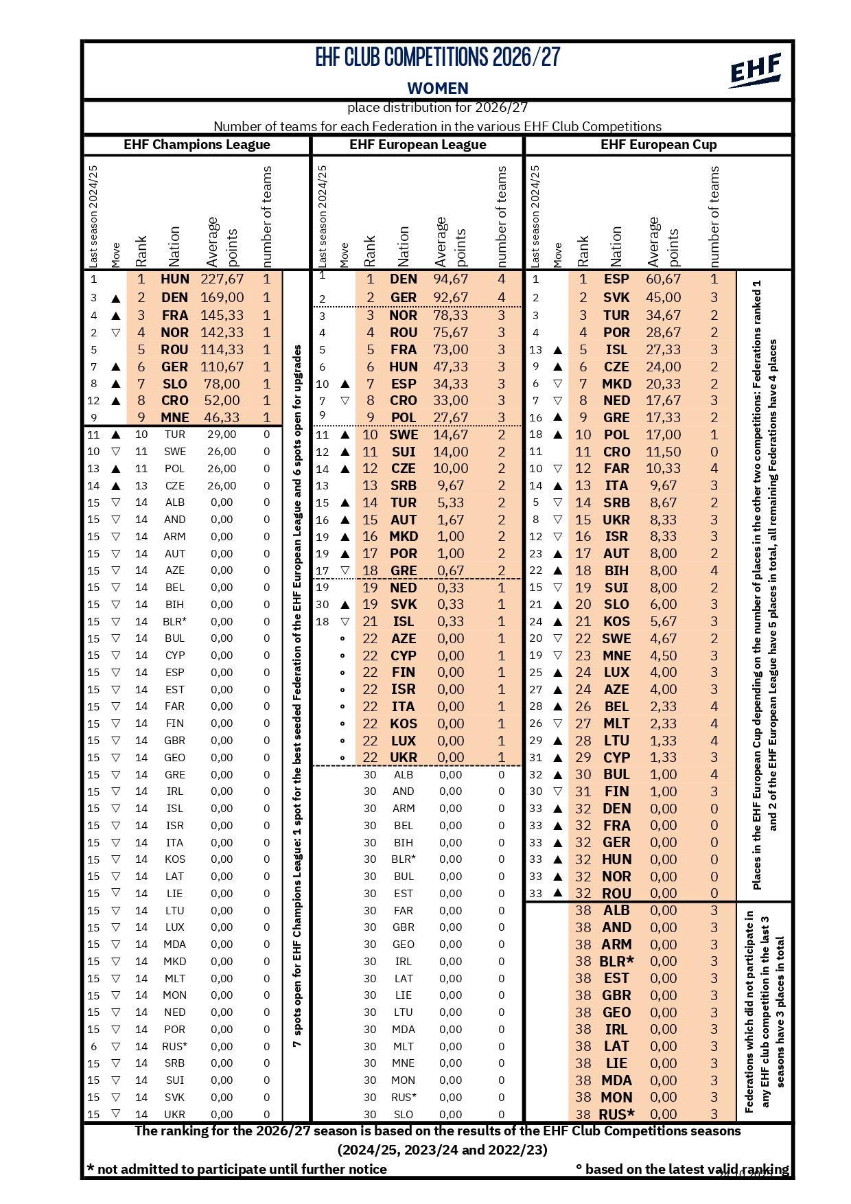 Во ЕХФ Европскиот Куп, Македонија има едно место помалку и пад од едно место – од шесто на седмо, па таму ќе може да се пријават третиот и четвртиот од Супер женската лига.