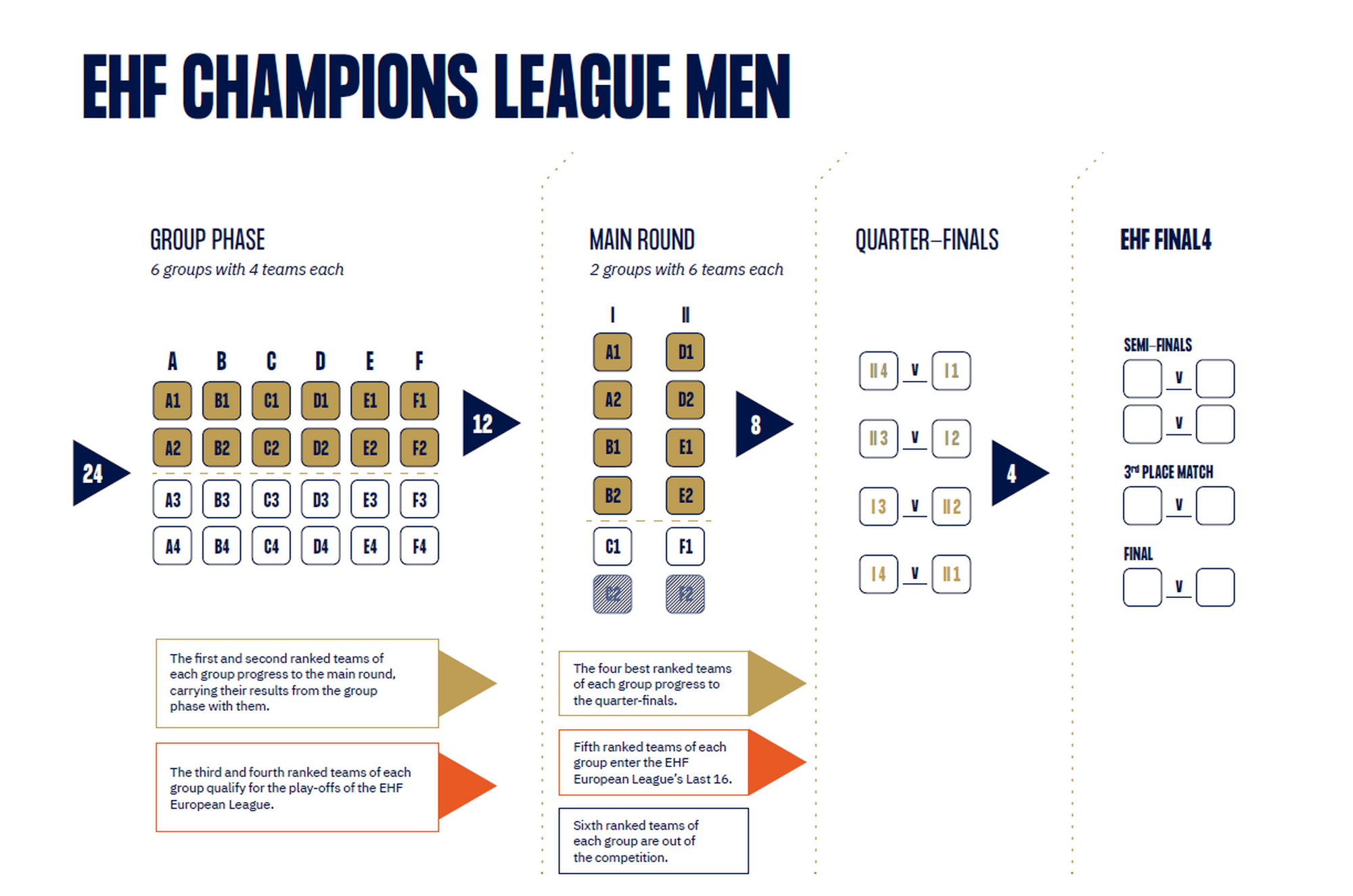 Првите четири тима од секоја група ќе обезбедат место во четвртфиналето, а победниците од тие дуели ќе патуваат на Ф4 во Келн.