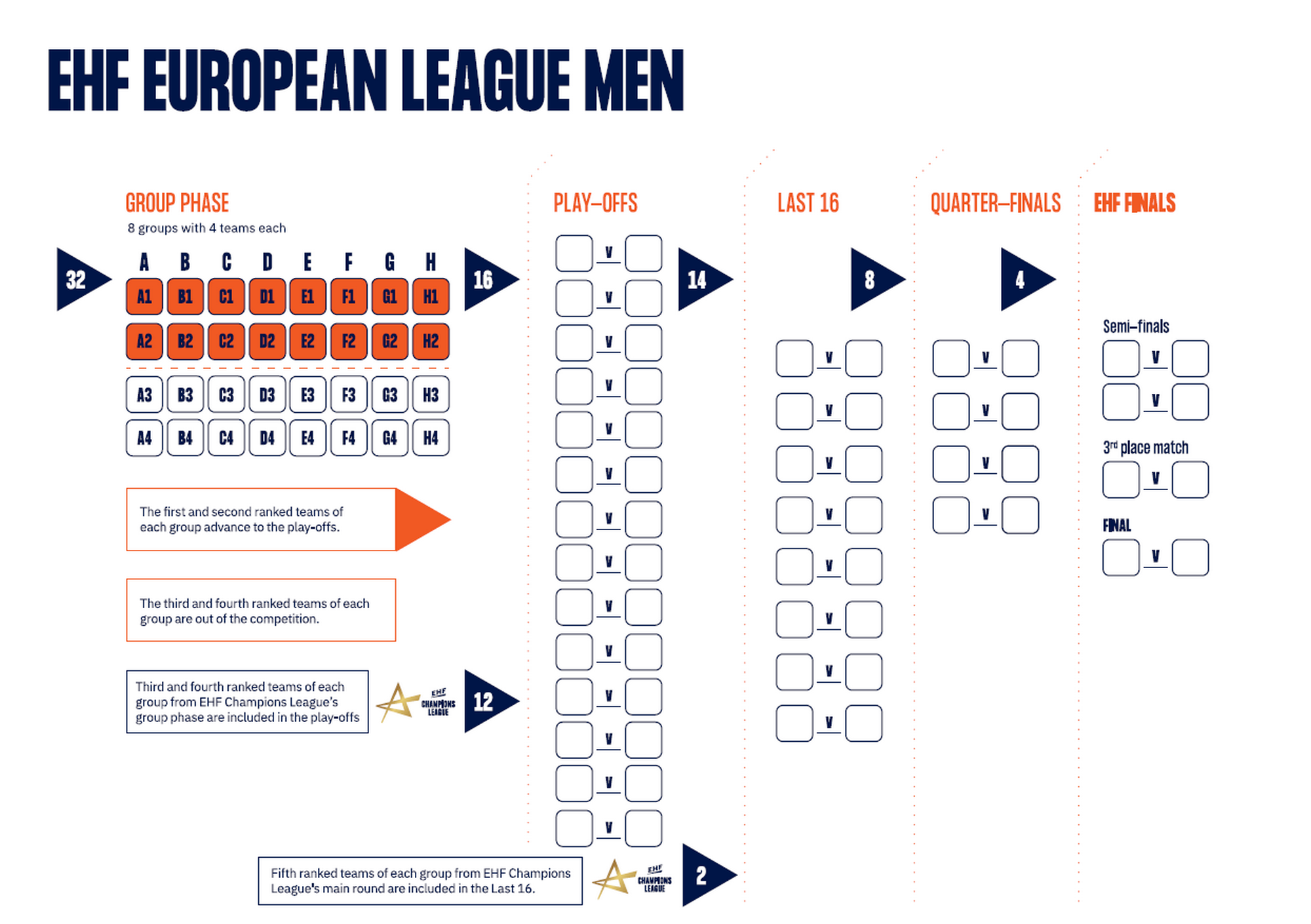 Победниците од тие дуели (вкупно 14 тима), заедно со двете петтопласирани од главната фаза на ЛШ, ќе го сочинуваат топ 16 на Европската лига, која потоа продолжува до финалниот викенд.