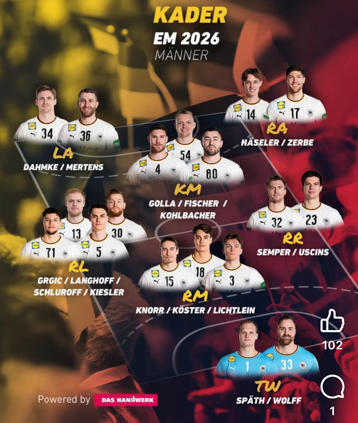 Од сите 18 ракометари што се на списокот на Гисласон, само еден игра надвор од Германија, а тоа е централниот бек Јури Кнор, кој е дел од данскиот Алборг.
