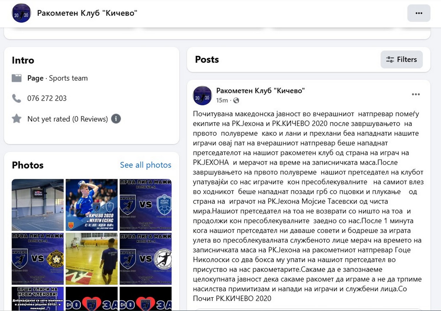„Нашиот претседател беше нападнат со два бокса во главата, во присуство на сите играчи. Сакаме да ја информираме јавноста дека ние сакаме да играме ракомет, а не да трпиме насилства и примитивизам,“ стои во соопштението на РК Кичево 2020.