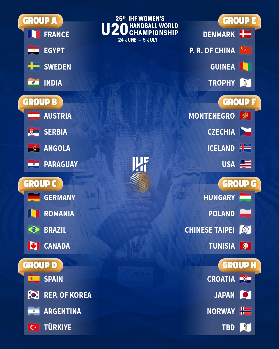 Актуелниот светски шампион Франција ќе настапи во групата А, каде ќе игра против Египет, Шведска и Индија. Европскиот шампион Германија е во групата Ц, заедно со Романија, Бразил и Канада.