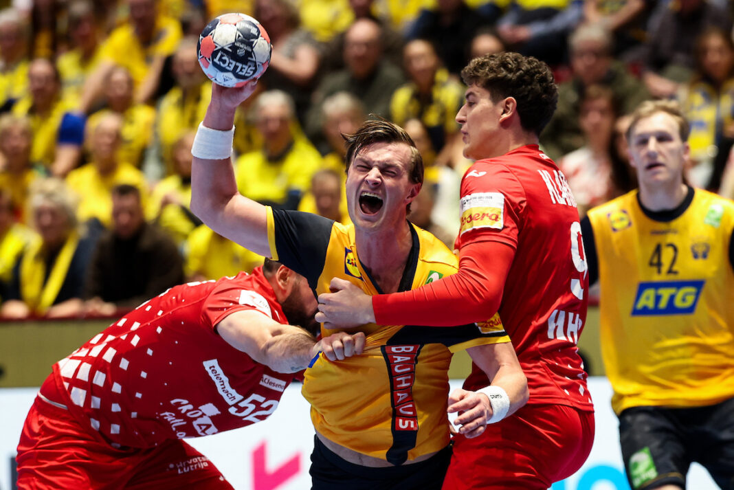 Едниот од трите домаќини на ЕП 2026, Шведска, ќе стартува со два бода во главната рунда, откако во дербито од групата Е во Малме, ја совлада Хрватска со убедливи осум гола разлика, 33-25.