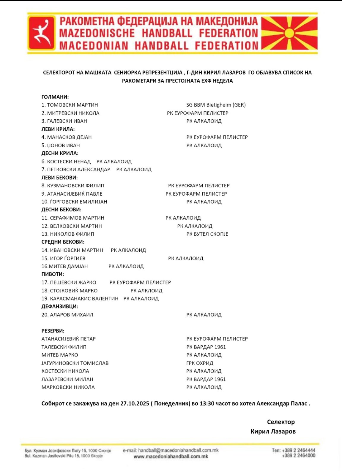 Селекторот на машката сениорска репрезентација, Кирил Лазаров, го објави списокот на ракометари за претстојната ЕХФ недела.