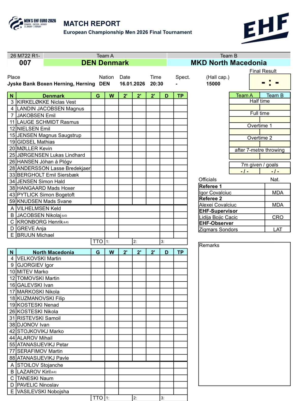 Европската ракометна федерација ги објави составите на Данска и Македонија за првиот меч на ЕП.