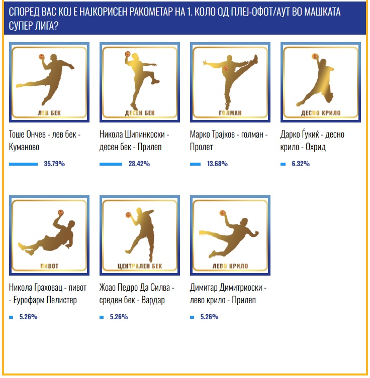 Номинирани за МВП на 1. коло од плеј-оф/аут во Супер машката лига беа уште и Димитар Димитриоски, Жоао Педро Да Силва, Никола Граховац, Дарко Ѓукиќ и Марко Трајков.