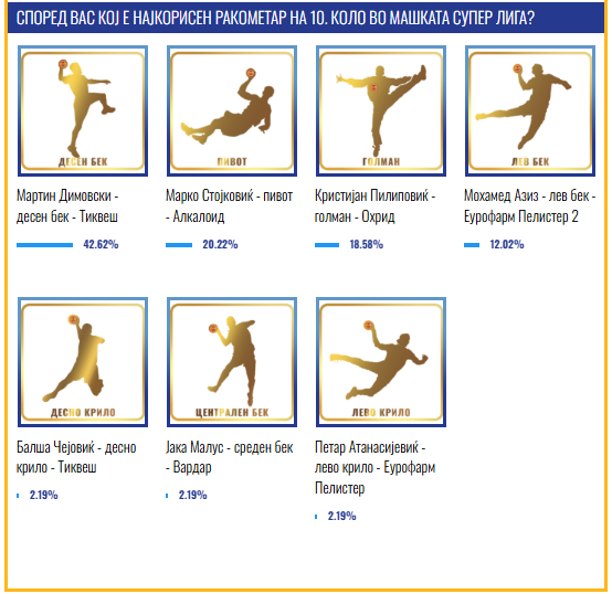 Десниот бек на Тиквеш, Мартин Димовски, го доби признанието за најкорисен играч, односно МВП на 10. коло од Супер машката лига.