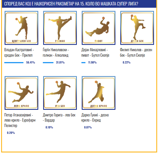 Средниот бек на Тиквеш, Владан Кастратовиќ, го доби признанието за најкорисен играч, односно МВП на 15. коло од Супер машката лига.