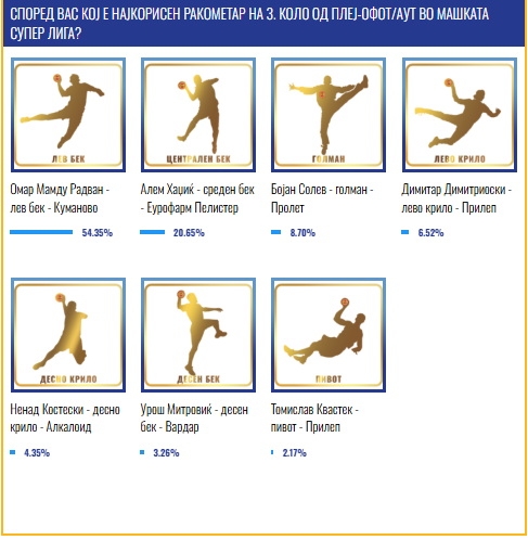 Номинирани за МВП на 3. коло од плеј-оф/аут во Супер машката лига беа уште и Томислав Квастек, Урош Митровиќ, Ненад Костески, Димитар Димитриоски и Бојан Солев.