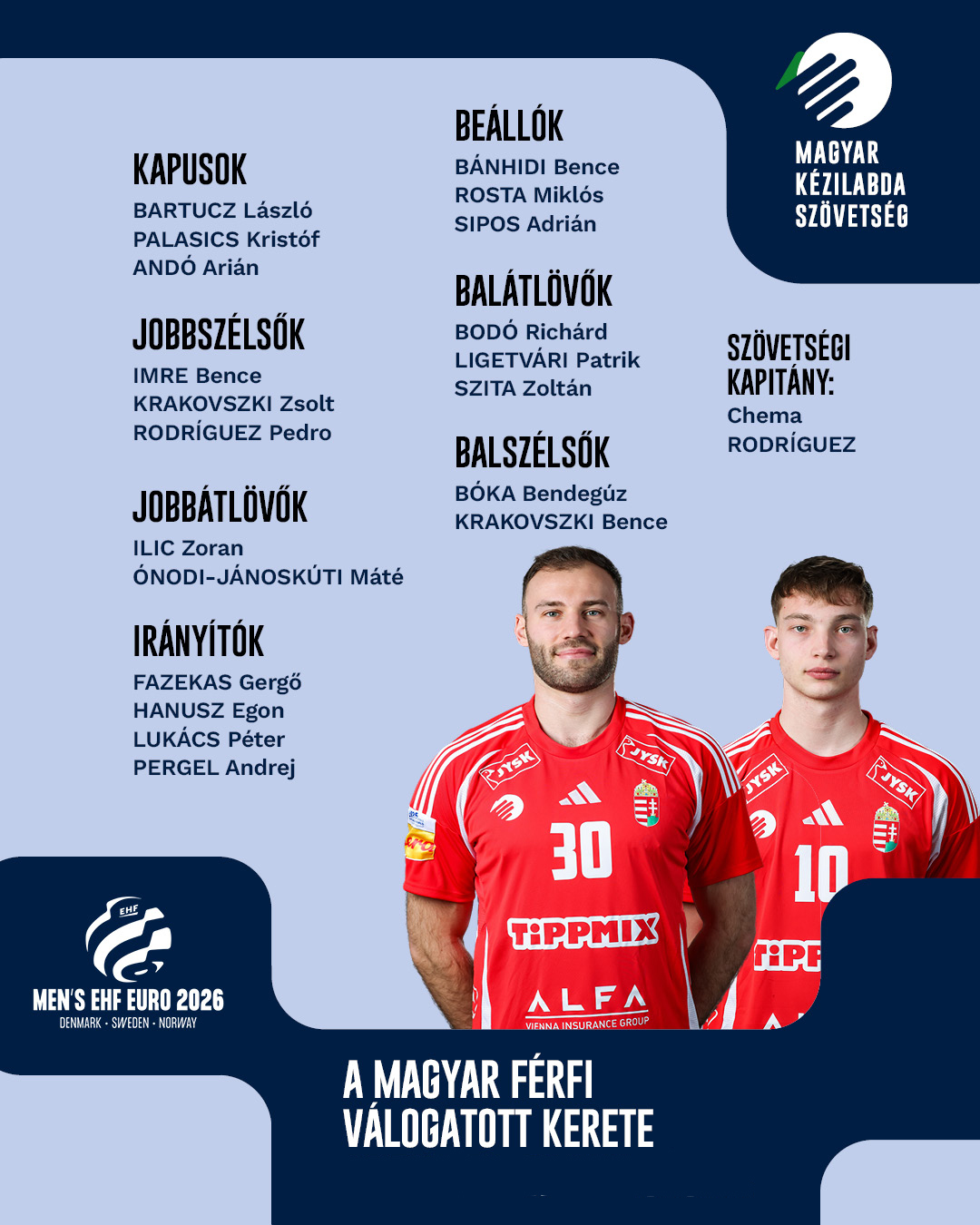 Селекторот на машката репрезентација на Унгарија, Чема Родригез, го објави скратениот список пред Европското првенство во Данска, Шведска и Норвешка.