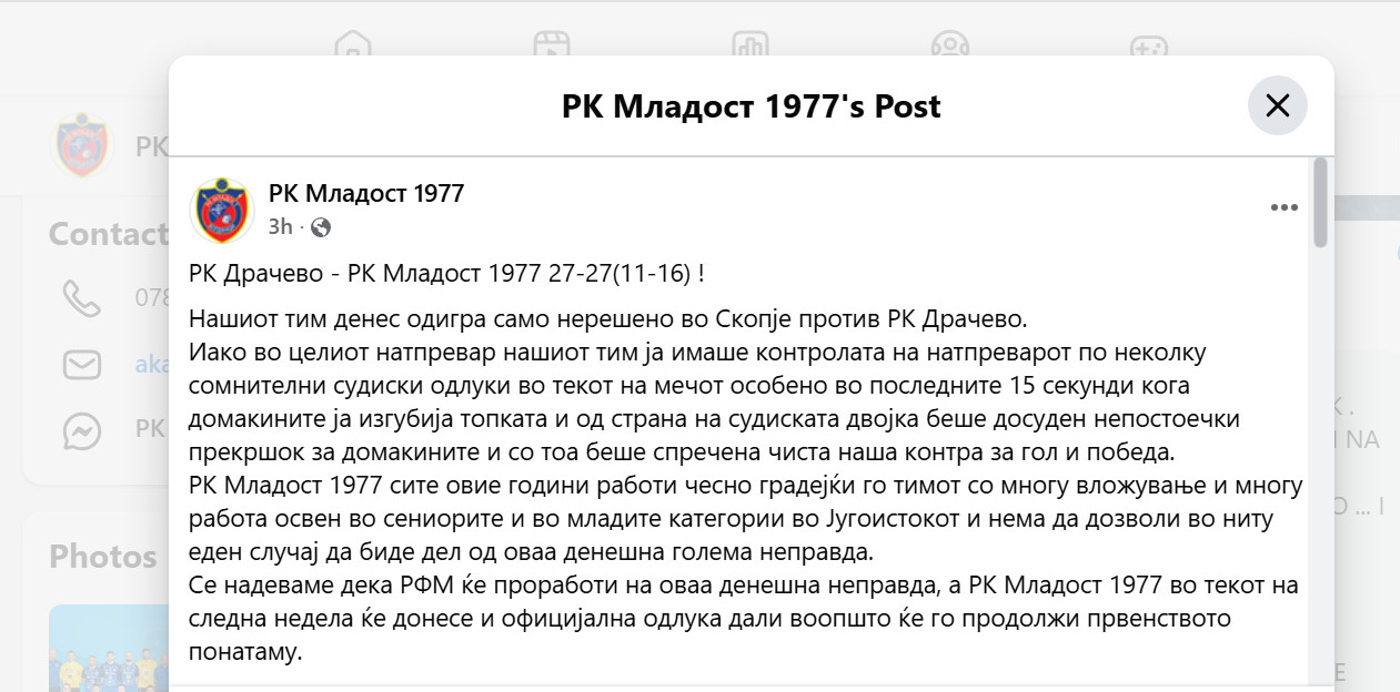 „Иако во целиот натпревар нашиот тим ја имаше контролата на натпреварот по неколку сомнителни судиски одлуки во текот на мечот особено во последните 15 секунди кога домаќините ја изгубија топката и од страна на судиската двојка беше досуден непостоечки прекршок за домаќините и со тоа беше спречена чиста наша контра за гол и победа, се вели во објавата на Фејсбук страната на клубот.