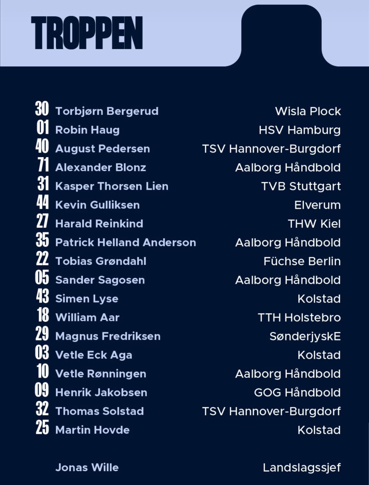 Виле ќе смета на 18 ракометари, меѓу кои се стандардните Торбјорн Бергеруд, Сандер Сагосен, Александер Блонц, Тобијас Грондал, Харалд Рајнкинд…