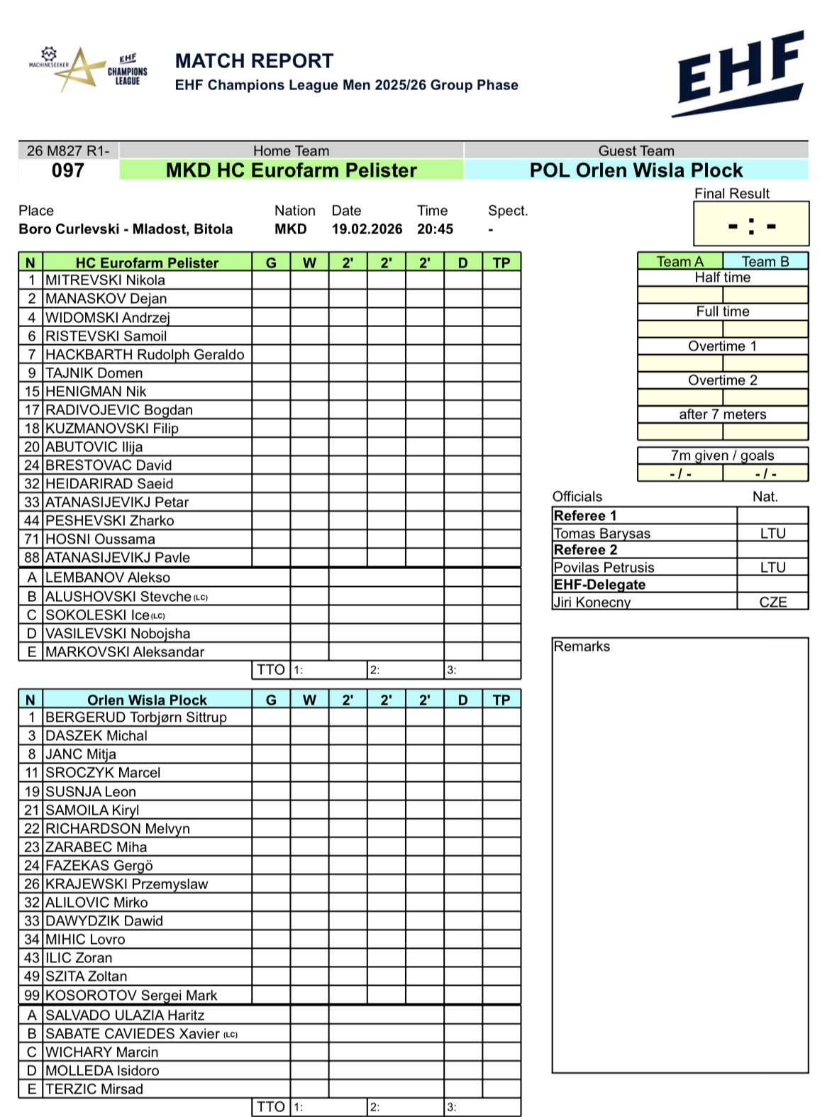Алушовски за овој меч нема да смета на Калајџиески, Хаџиќ и Кузманоски, додека сите останати ќе има на располагање. Во тимот на Висла Плоцк недостигаат Абел Сердио и Мирсад Терзиќ.