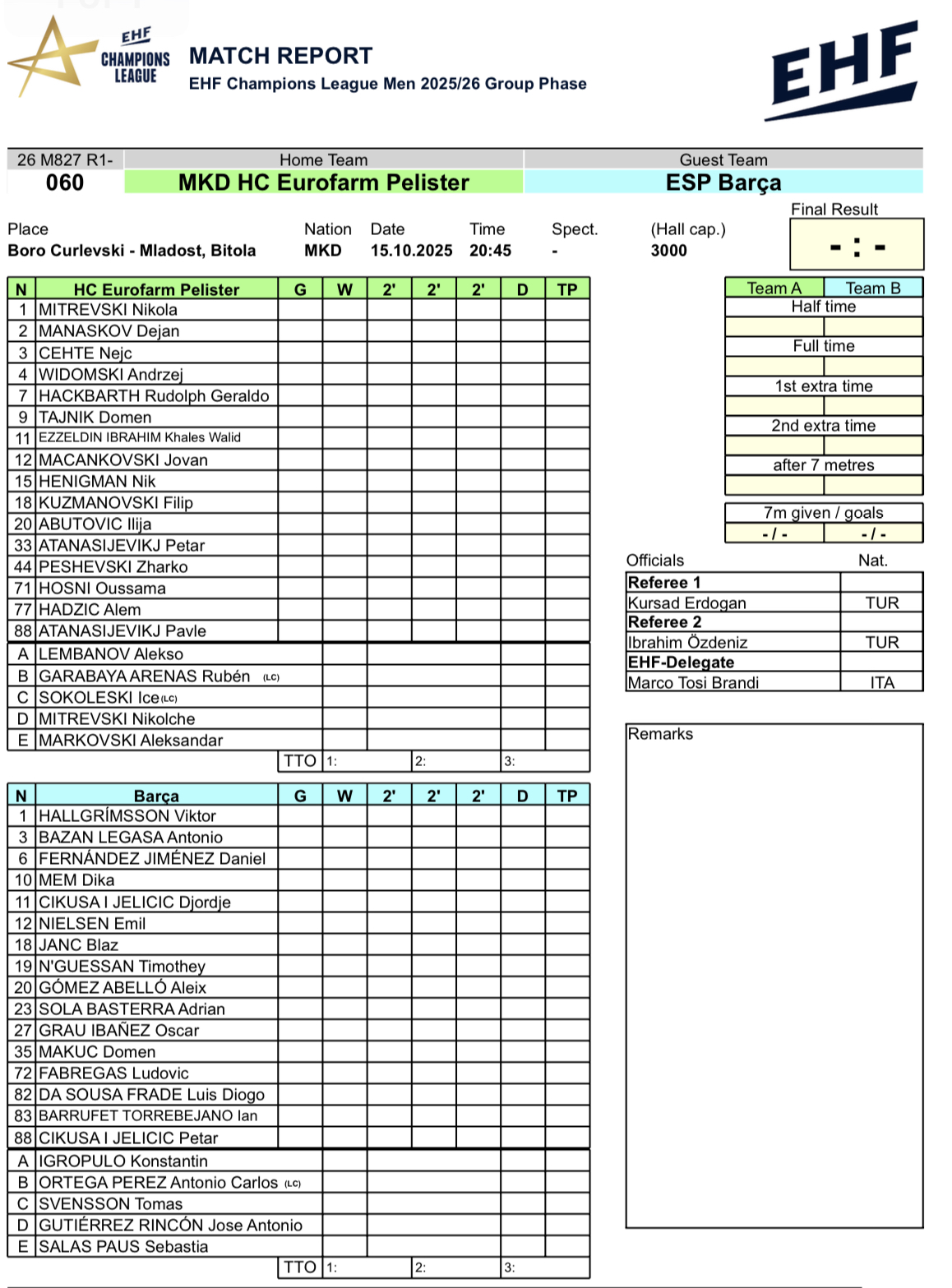 Европската ракометна федерација ги објави составите на Еурофарм Пелистер и Барселона за денешната пресметка во Лигата на шампионите.