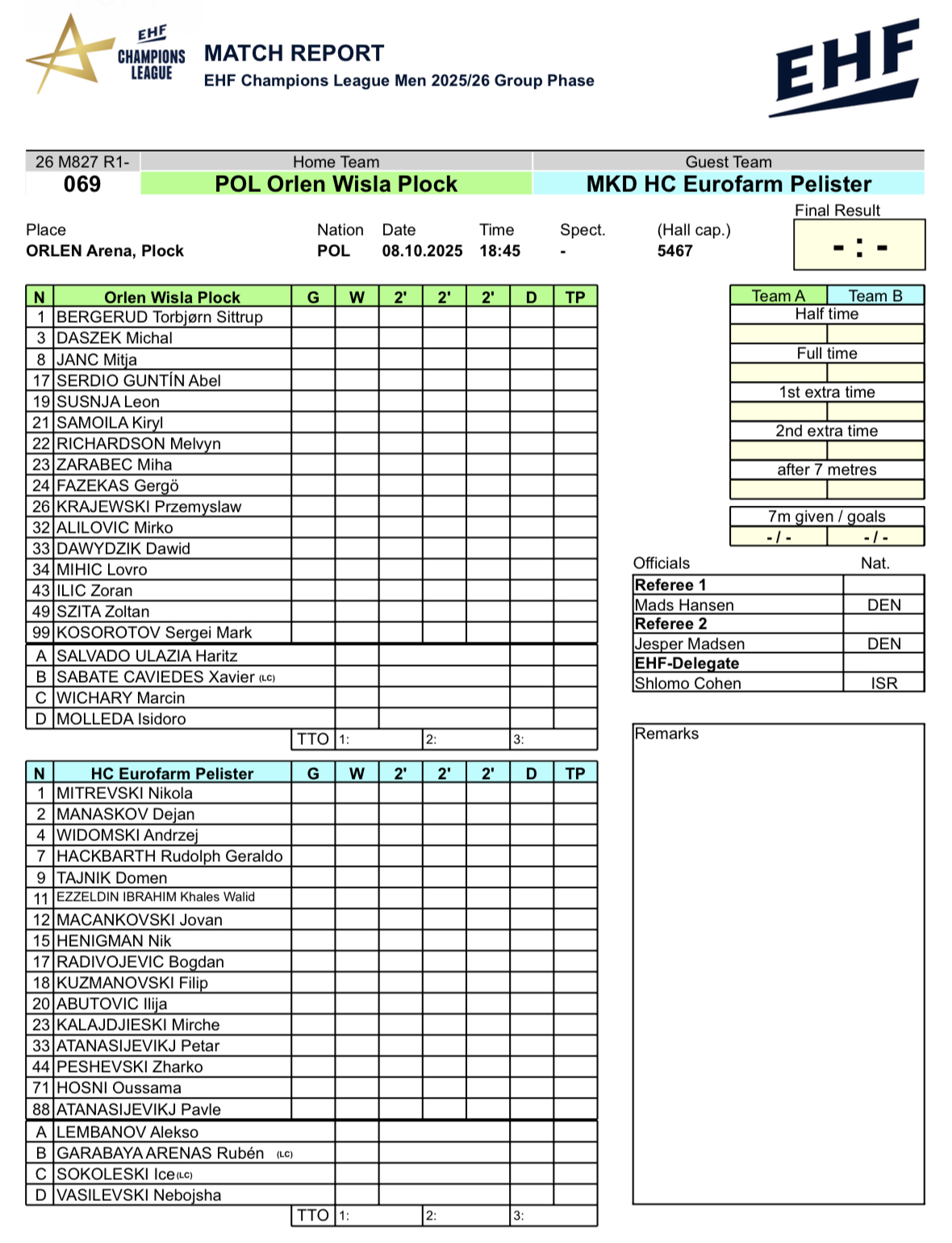Европската ракометна федерација ги објави составите на Еурофарм Пелистер и Висла Плоцк за пресметката во Лигата на шампионите.