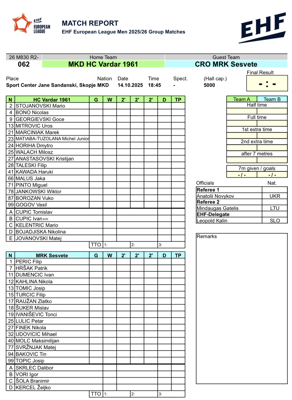 Натпреварот меѓу Вардар и хрватскиот Сесвете се игра во СЦ „Јане Сандански“ со почеток во 18:45 часот.
