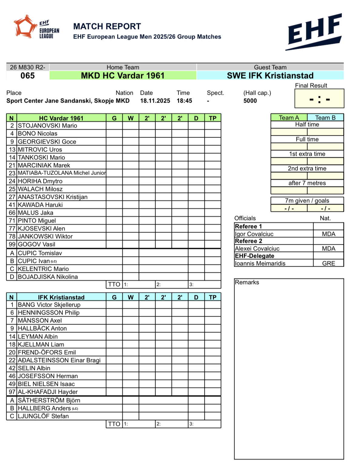 Во составот на Кристијанштад ќе бидат само 12 ракометари, а ќе недостига еден од најдобрите – Елиот Стенмалм. Нема да игра ниту пивотот Вилијам Хогхиелм, ниту Тео Иварсон.