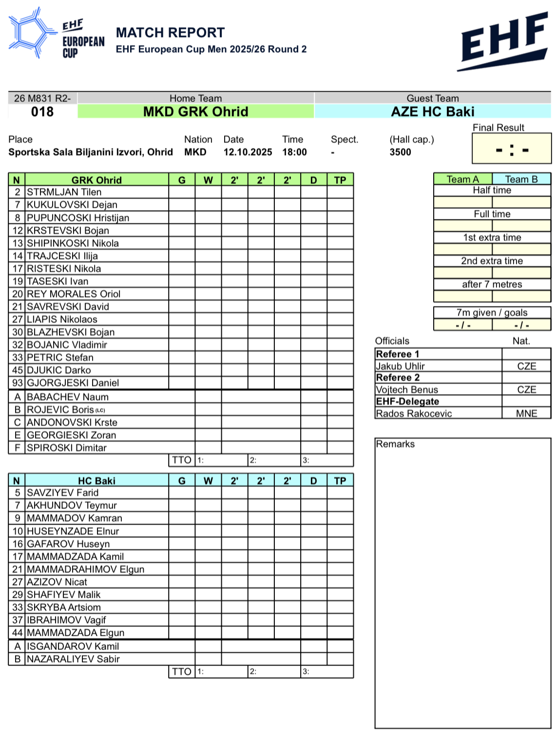 Европската ракометна федерација ги објави составите на Охрид и Баку за вториот натпревар од второто коло во ЕХФ Европскиот Куп.