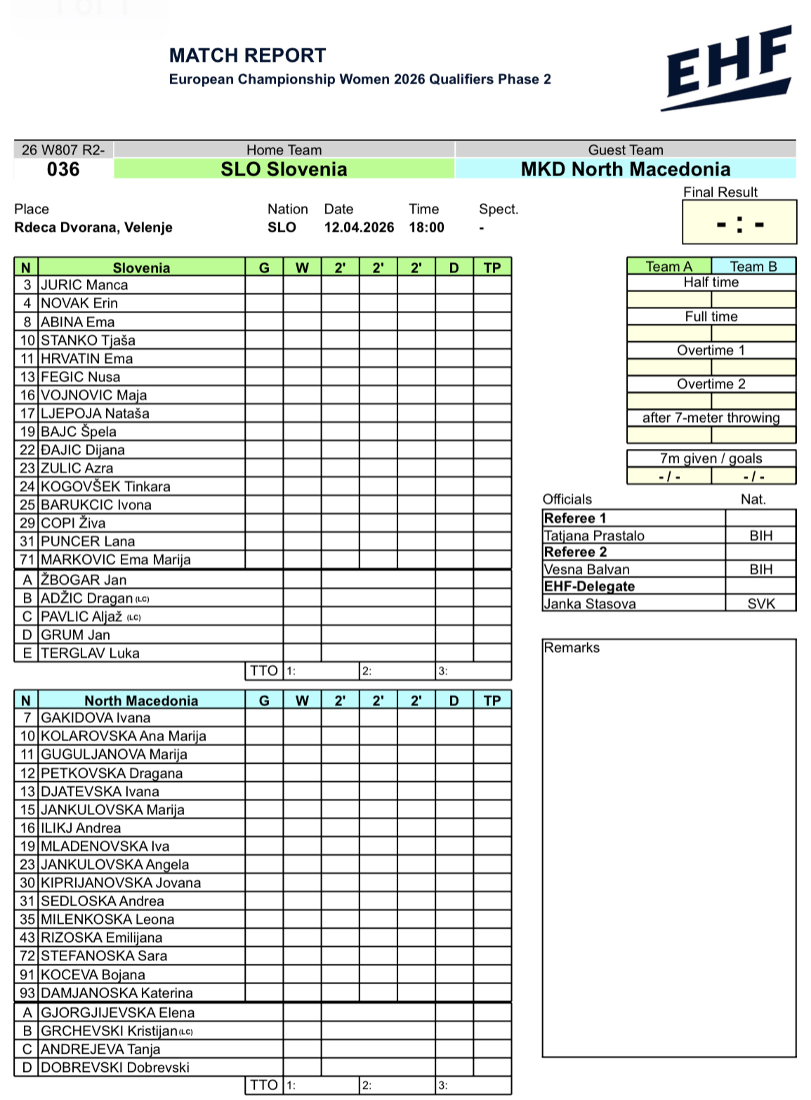 Нема да играат ниту Матеа Чурлиновска, Теодора Дукоска и Таида Беровиќ. Мечот меѓу Словенија и Македонија се игра вечерва во „Рдеча Дворана“ во Велење од 18:00 часот.
