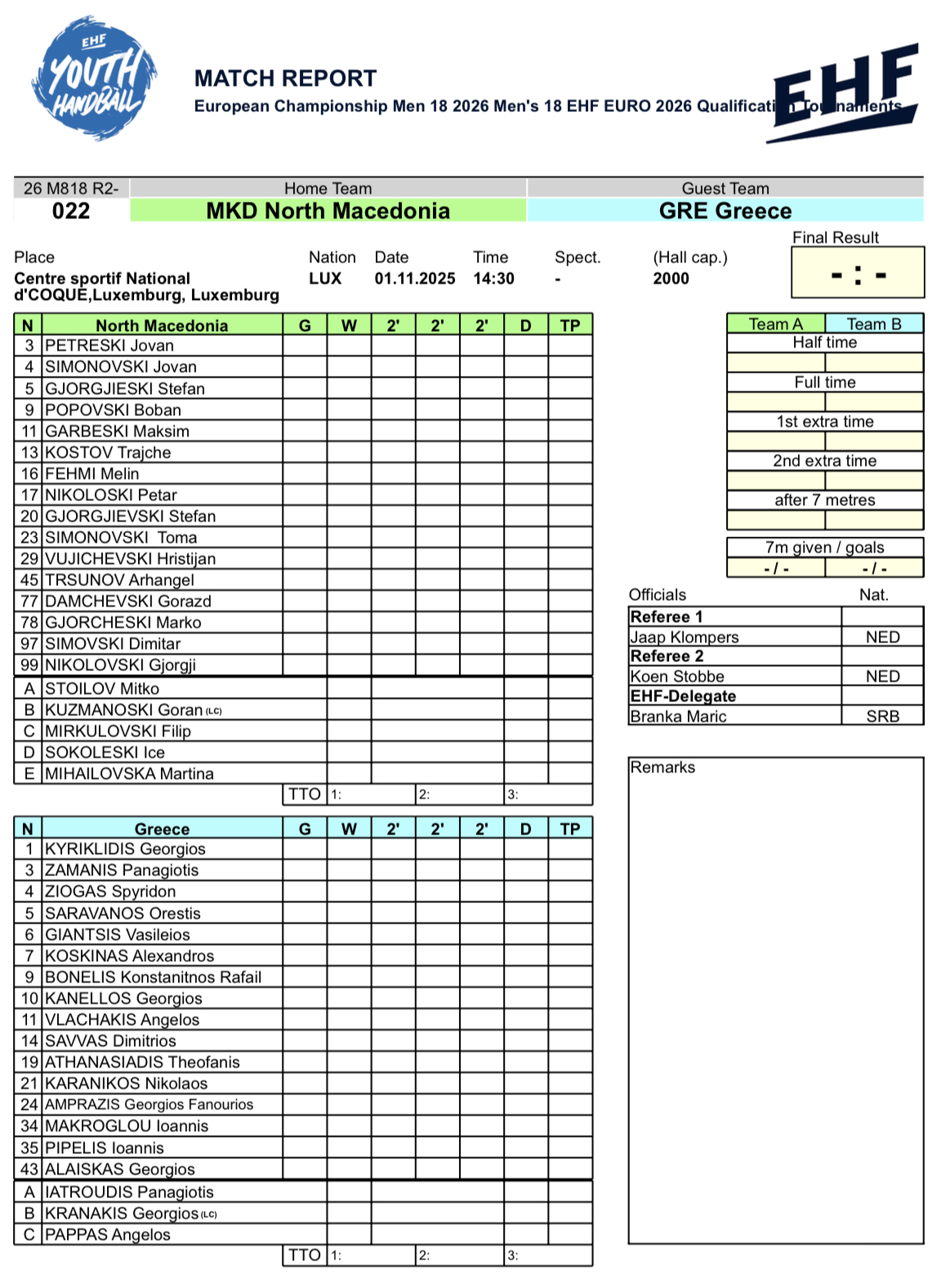 Натпреварот меѓу Македонија и Грција се игра денеска со почеток во 14:30 часот во националниот спортски центар во Луксембург.
