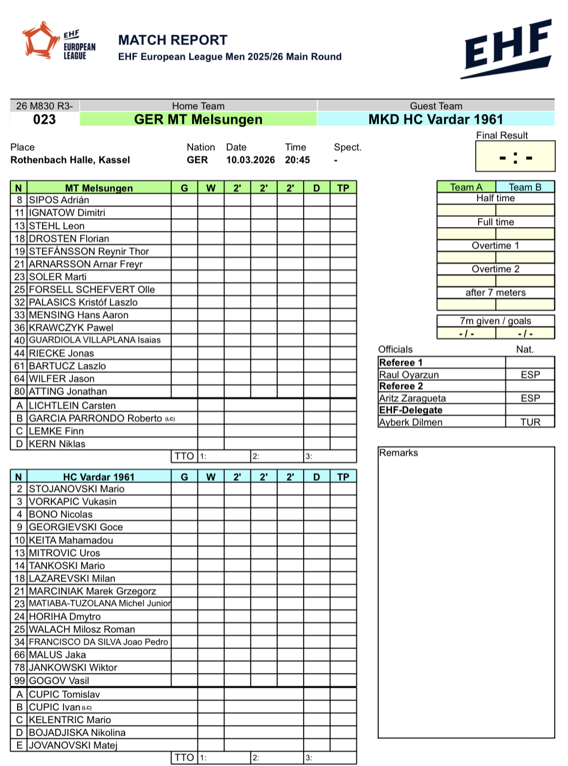 Натпреварот меѓу Мелсунген и Вардар се игра вечерва во „Ротенбах Арена“ во Касел од 20:45 часот.