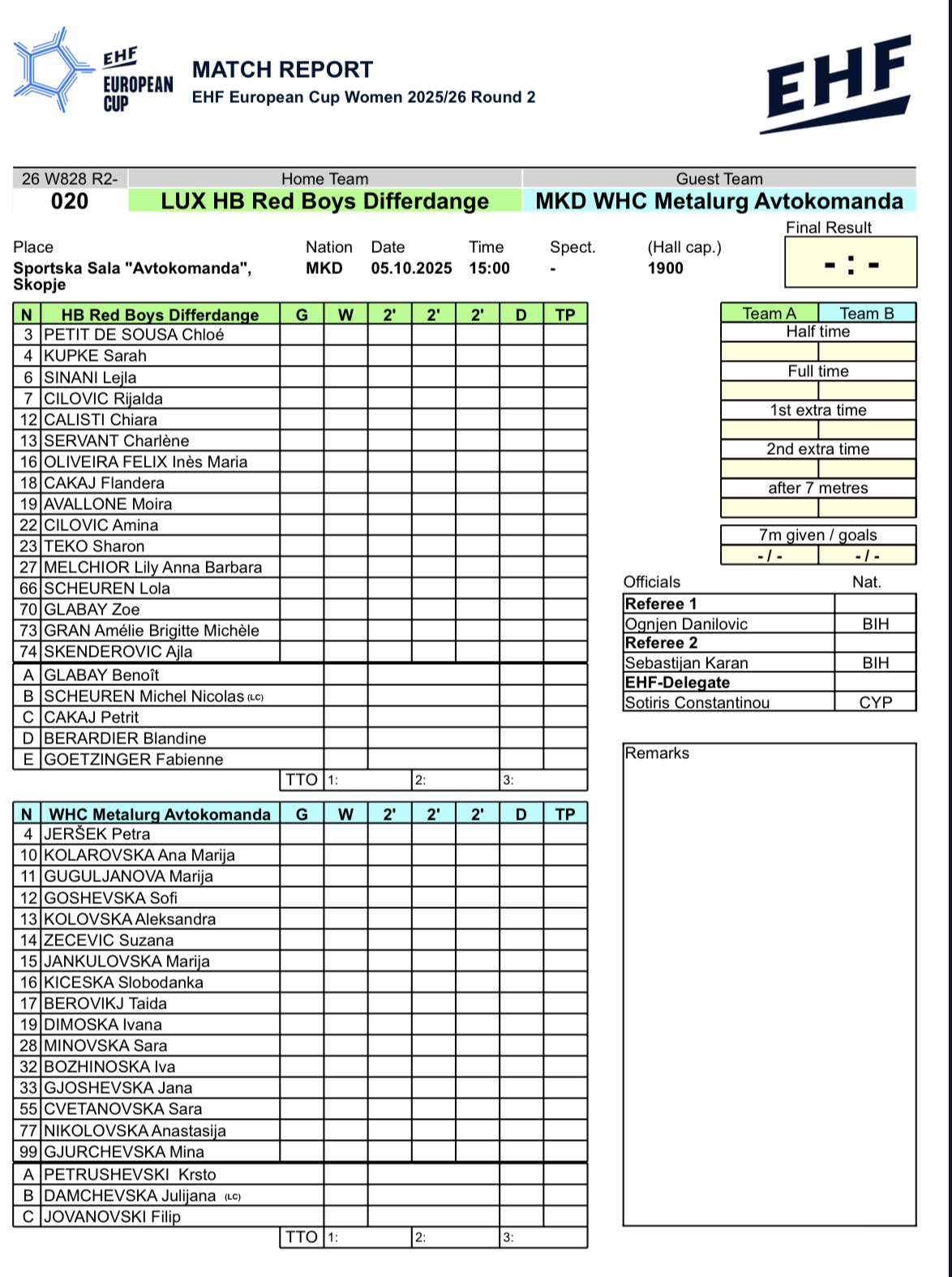 Европската ракометна федерација ги објави составите на Металург Автокоманда и Диферданж од Луксембург за вториот меч од второто коло во ЕХФ Европскиот Куп.