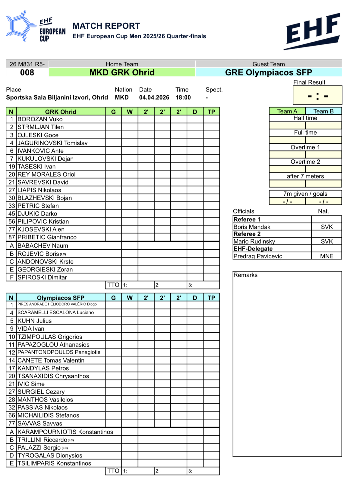 ПОЗНАТИ СОСТАВИТЕ: Охрид со една промена, Олимпијакос со истите 16 од првиот меч
