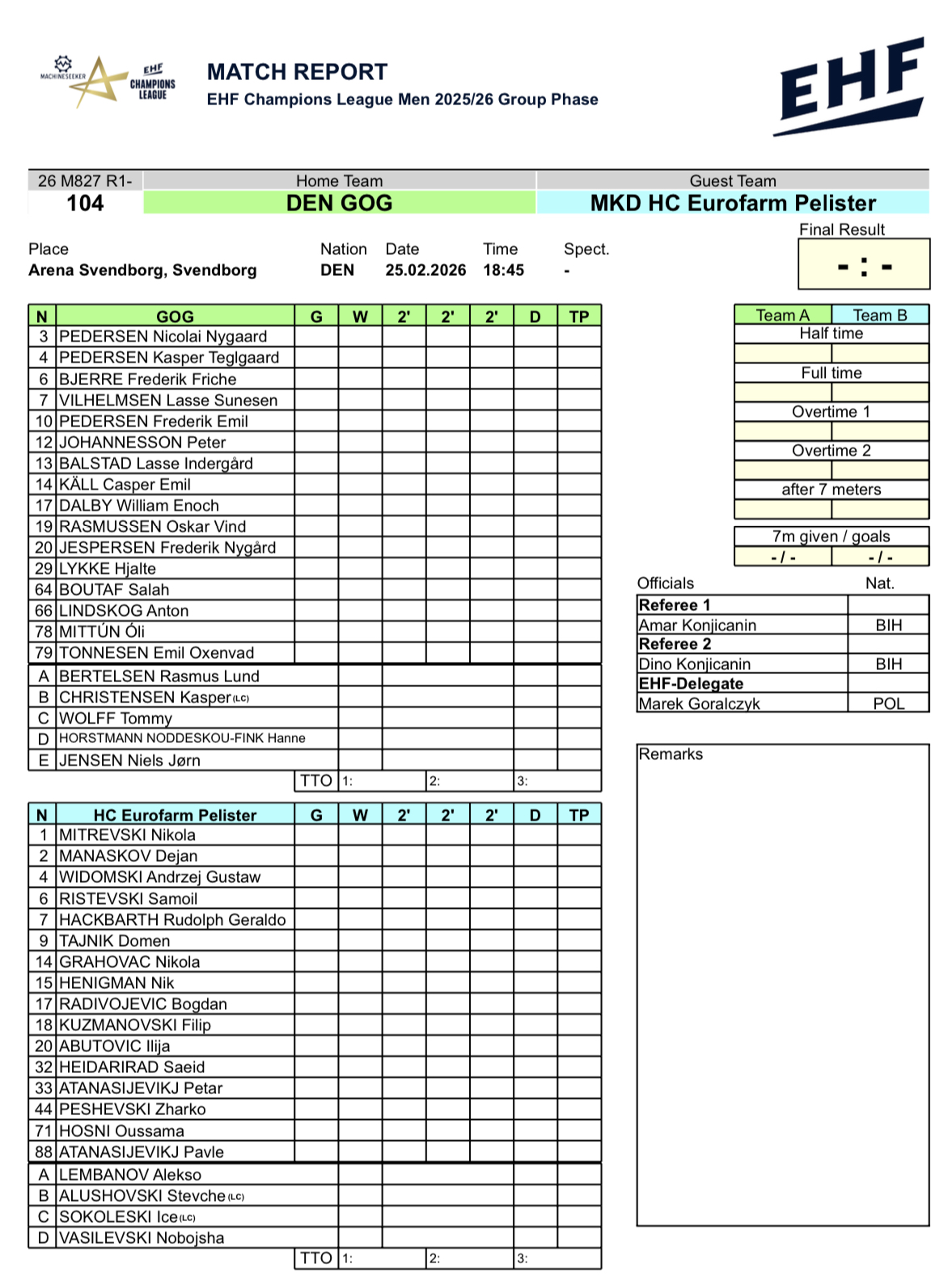 Европската ракометна федерација ги објави официјалните состави на ГОГ Гудме и Еурофарм Пелистер за пресметката во Лигата на шампионите.