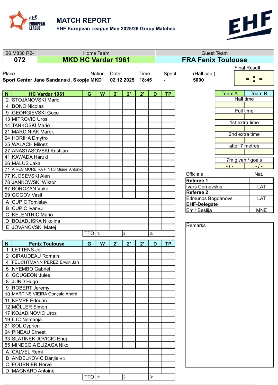 Кај Вардар ќе недостигаат повредените ракометари, па Чупиќ ќе смета на најсилниот состав што може да го има во моментов, а Тулуз иако нема никакви шанси за прогрес, исто така ќе биде со најдобрите.