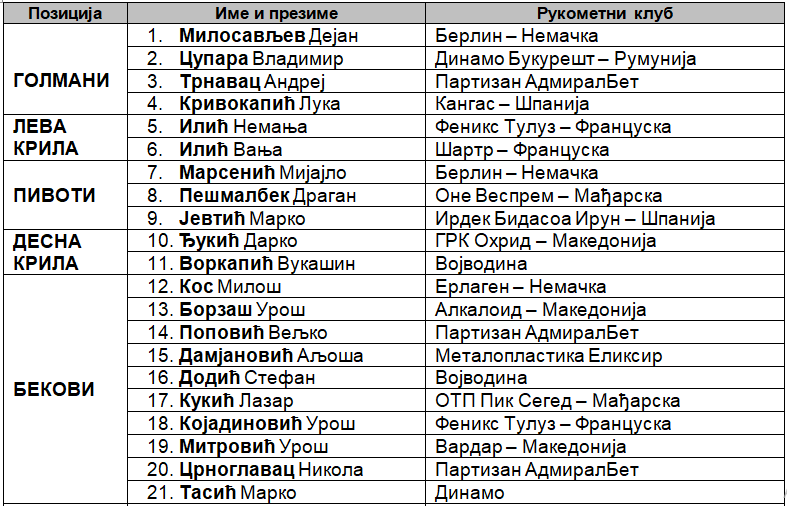 Меѓу 21 ракометар се тројцата интернационалци од Македонија – левиот бек Урош Борзаш, десниот бек Урош Митровиќ од Вардар и десното крило Дарко Ѓукиќ од Охрид.