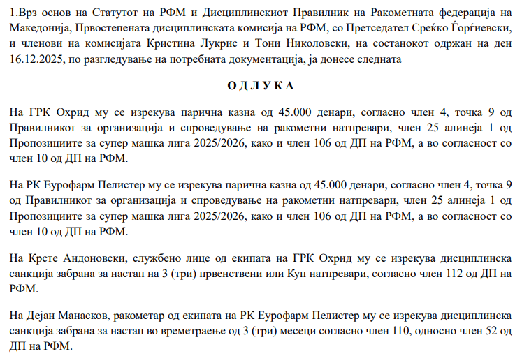 Дисциплинската комисија на Ракометната федерација на Македонија ги изрече казните по мечот меѓу Охрид и Еурофарм Пелистер.