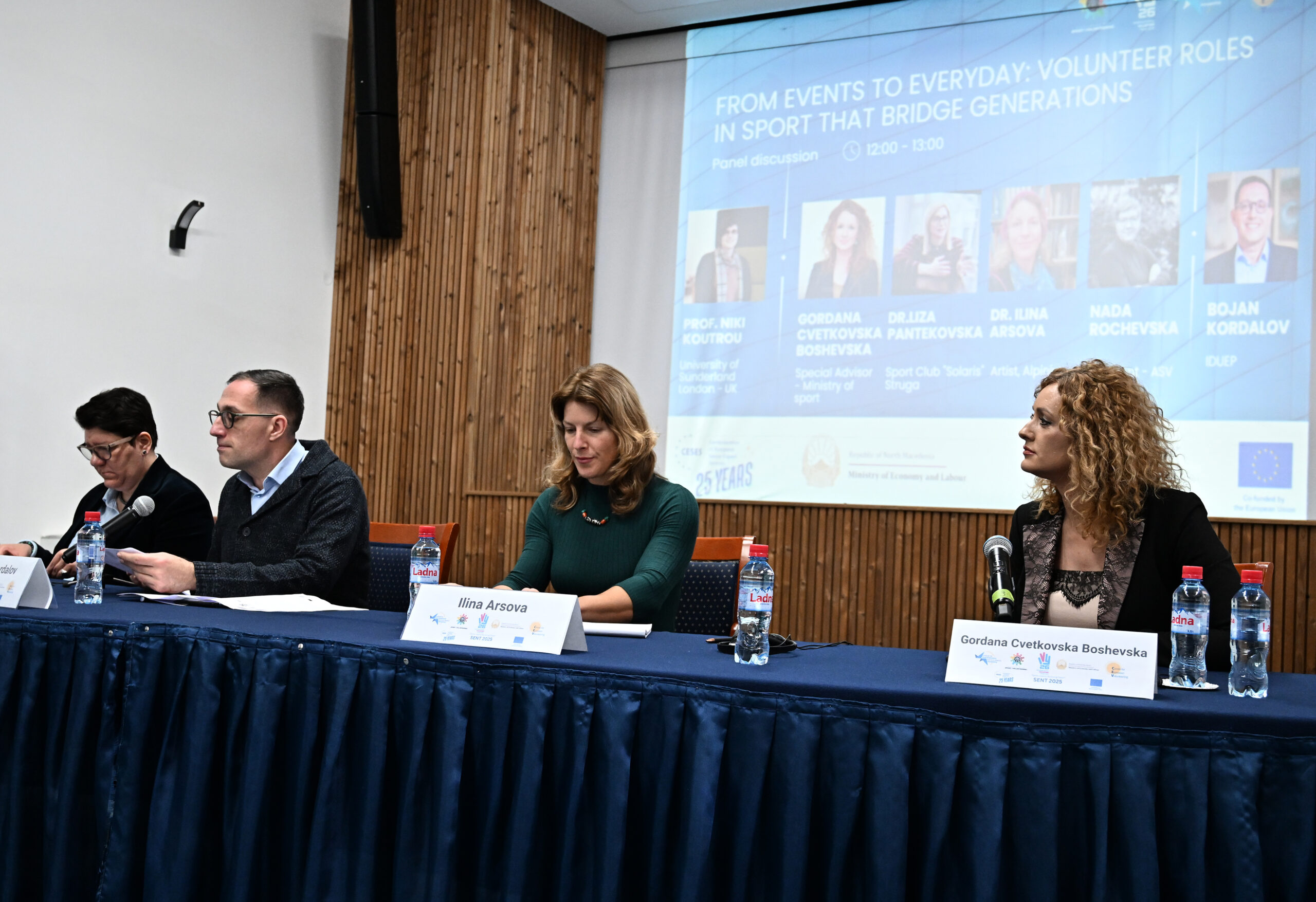 Волонтерство во спортот беше тема на панел-сесијата „Од спортски настани до секојдневие: Волонтерски улоги во спортот што ги поврзуваат генерациите“, на која учествуваа претставници од Министерството за спорт, претставници на образовниот и невладиниот сектор, како и поранешни спортисти и тренери. Во обраќањата на присутните панелисти беше потенцирано дека „спортот е природна и моќна платформа за социјална промена во светот, а волонтерството негова алатка“.