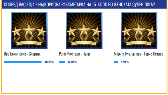 Ракометарката на Спартак, Ива Божиноска, го доби признанието за најкорисен играч, односно ѕвезда на 15. коло во Супер женската лига.